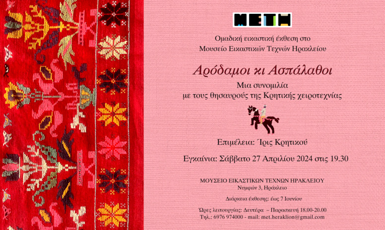Η συμμετοχή μου στην ομαδική έκθεση «ΑΡΟΔΑΜΟΙ ΚΙ ΑΣΠΑΛΑΘΟΙ» στο Μουσείο Εικαστικών Τεχνών Ηρακλείου Κρήτης σε επιμέλεια Ίριδος Κρητικού. Απρίλιος – Ιούνιος 2024.