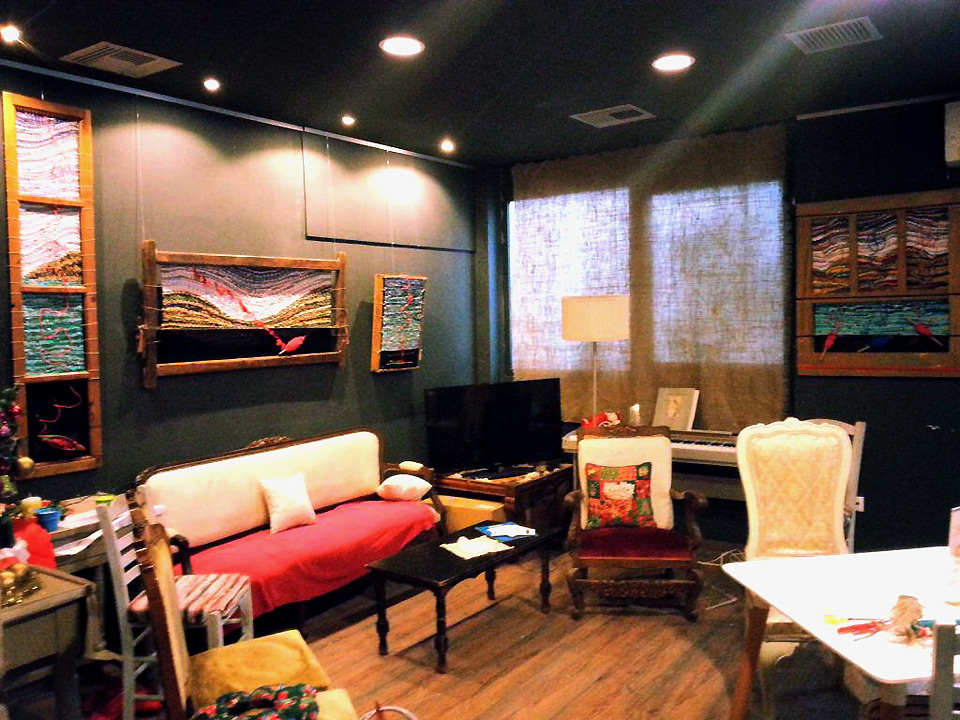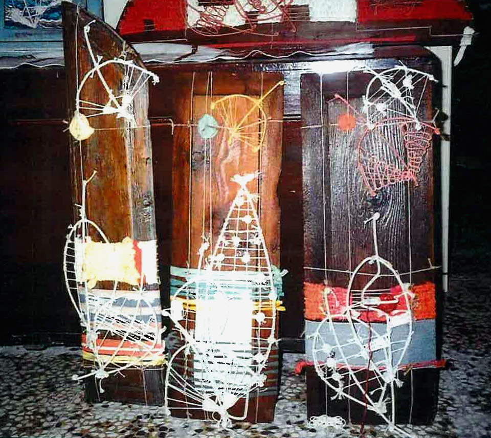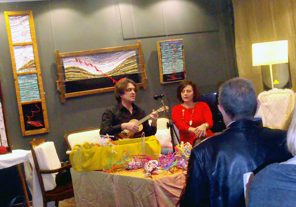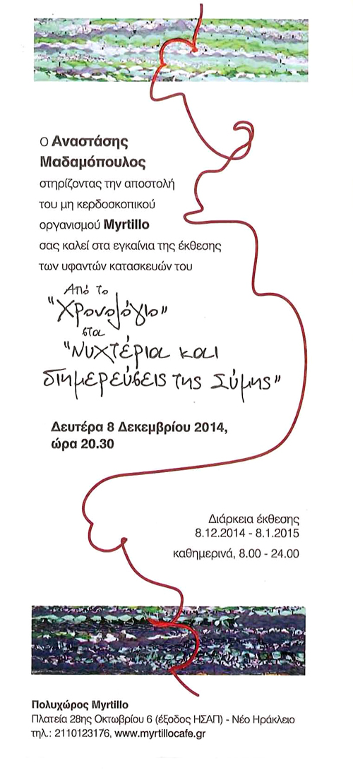 Λίγα έργα από το «Χρονολόγιο» μετά από δεκατέσσερα χρόνια συναντούν τις υφαντές κατασκευές των τελευταίων χρόνων και δημιουργούν τον σκηνικό χώρο για μια σειρά διαλέξεων με θέμα τον Λαβύρινθο, την πλοκή, τη διαπλοκή, την Αριάδνη, τον μίτο, την ύφανση αλλά και για θεραπευτικά προγράμματα σε νέους με αυτισμό που εργάζονται και εκπαιδεύονται στην κοινωνική συνεταιριστική επιχείρηση Μύρτιλλο.
